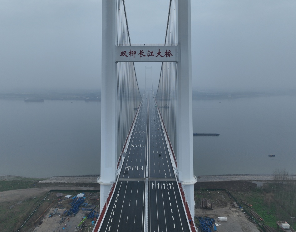 双柳长江大桥项目全长35.043公里,其中跨江主桥长1630米,主跨1430米,采用双向八车道设计,设计时速120公里,桥面宽度达50.5米,是目前长江上桥面最宽的公路悬索桥。项目从开工到主体工程交工验收仅用时39个月,刷新了长江大桥建设速度纪录。